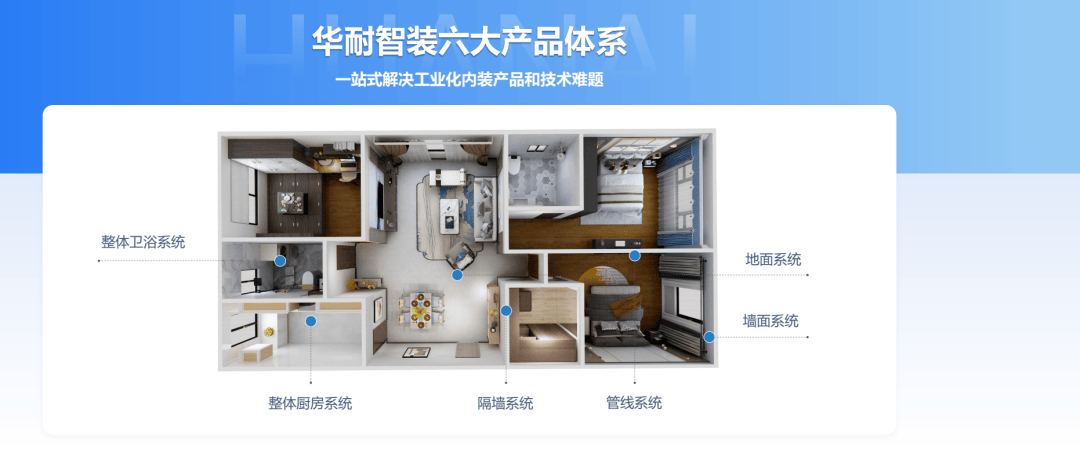 当前已构建起涵盖整体卫浴、整体厨房、隔墙、地面、墙面、管线的六大产品体系,可灵活适配住宅、公寓、酒店、医疗、适老、康养、教育等多元应用场景,一站式解决工业化内装全流程产品与技术难题。