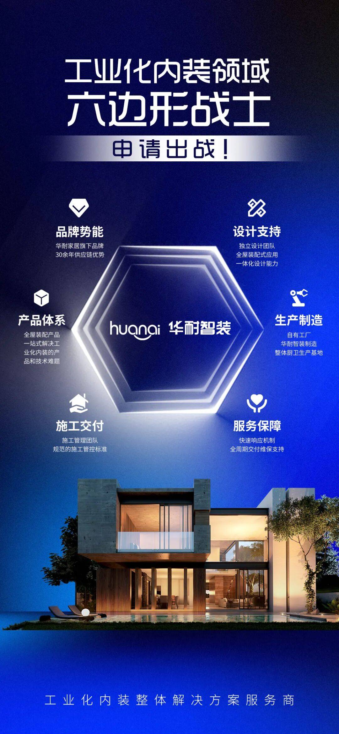 工业化内装凭借高效、环保、标准化的核心优势,正成为重塑家居与建筑行业发展格局的关键力量。在这一行业变革浪潮中,华耐智装凭借覆盖品牌、生产、产品、设计、施工、服务的全维度核心优势,打造工业化内装领域的“六边形战士”。依托集团三十余年的行业积淀,华耐智装以工业化内装整体解决方案为核心抓手,引领工业化内装行业高质量发展。